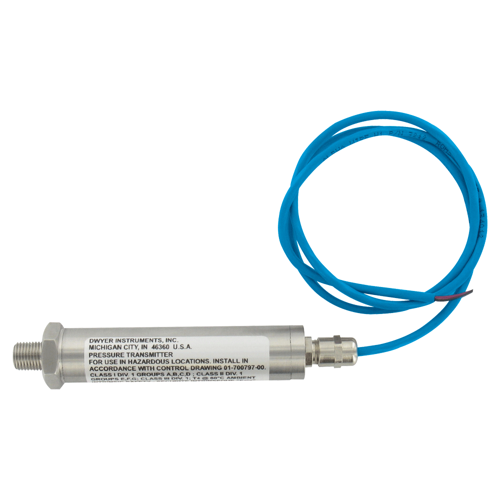 IS626-09-GH-P1-E1-S1 | Intrinsically safe pressure transmitter, 50 psi pressure range, 4-20 mA output, 1/4" NPTM, general purpose housing. |