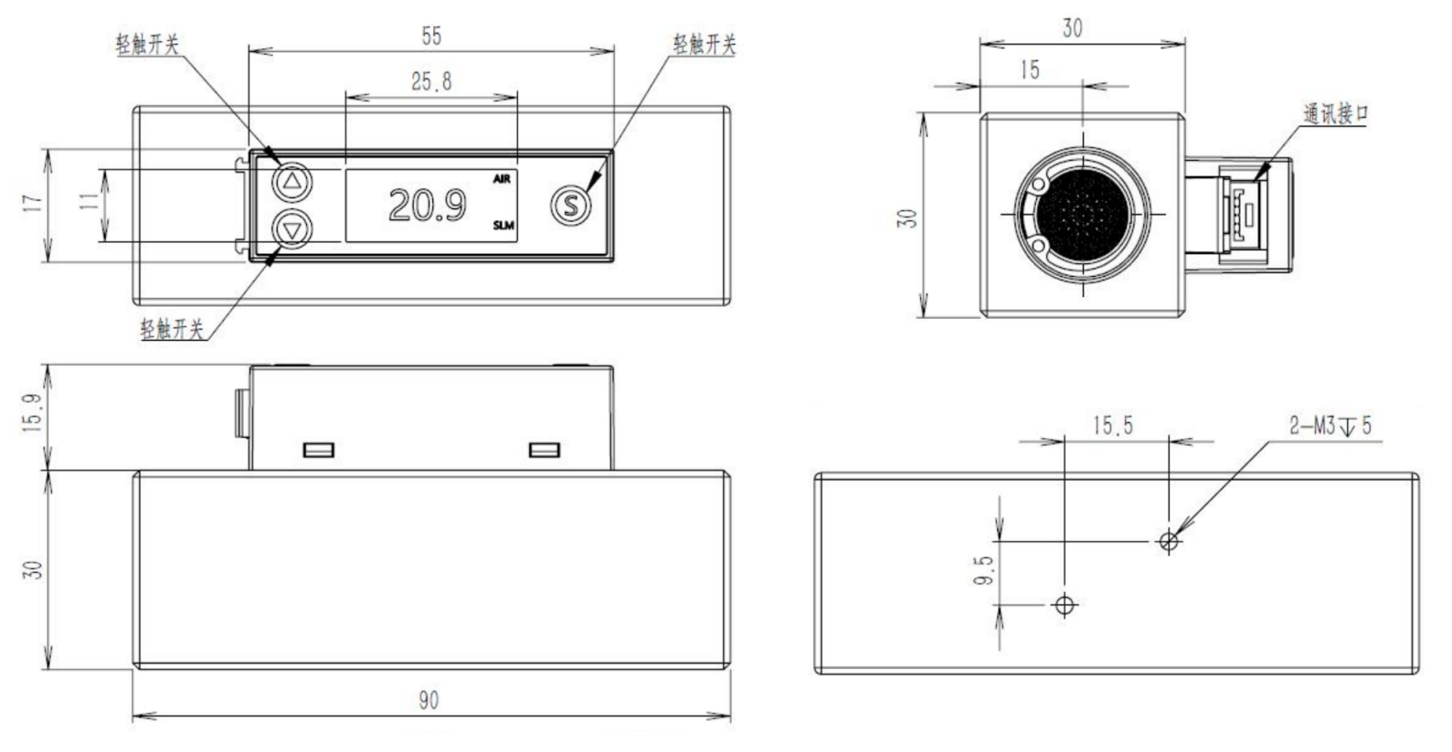 提供Modbus-RTU (RS485)數(shù)字信號,模擬信號(4-20mA或0-5V)通信接口,和開關量輸出。所需的電源電壓為9-32V。